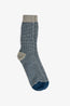 Pletené dvojfarebné ponožky vyrobené zo zmesi recyklovanej vlny, TENCEL™ Lyocell, recyklovaného polyamidu a recyklovaného kašmíru. Ponožky majú rebrovanú štruktúru a hravý dizajn. Vďaka príjemnému a mäkkučkému materiálu sú vhodné do chladných dní, či len tak do pohodlia domova.